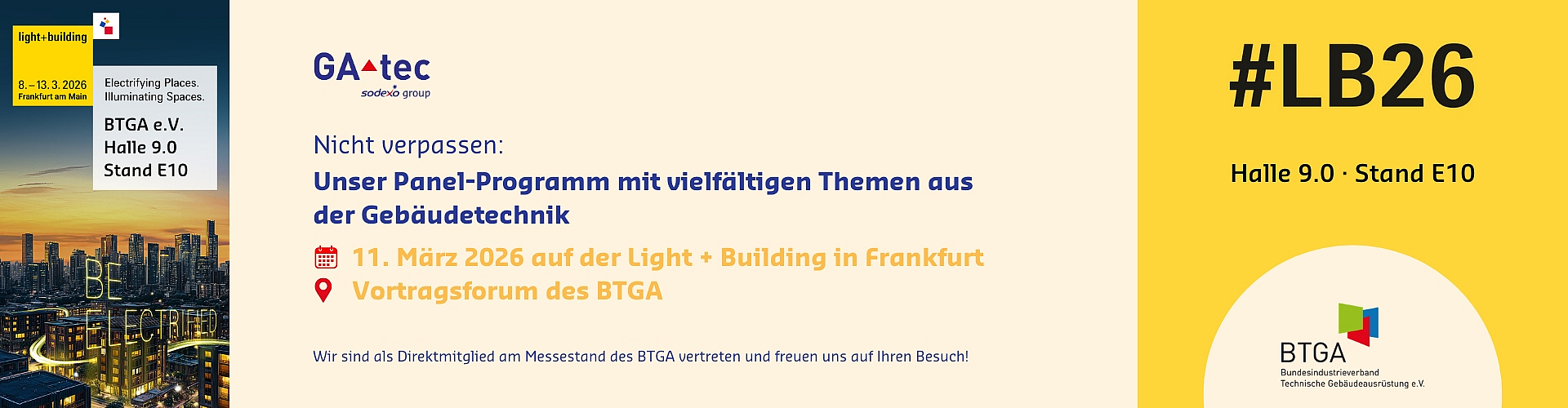 Der BTGA – Bundesindustrieverband Technische Gebäudeausrüstung e.V. ist auch in 2026 wieder mit einem eigenen Stand vertreten und knüpft damit an die erfolgreiche Präsenz der letzten Jahre in Frankfurt an. Eine Besonderheit: Die Fachmessen ISH (ungerade Jahre) und Light + Building (gerade Jahre) wechseln sich jeweils ab, sodass der Verband seine gesamte Gewerkevielfalt der Technischen Gebäudeausrüstung am Messestandort präsentieren kann.