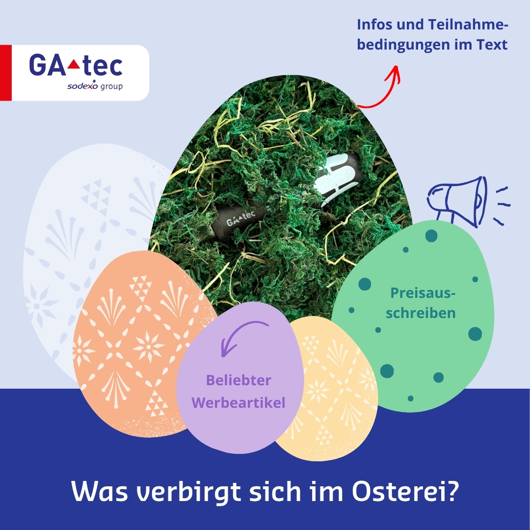 Im Osterei verbirgt sich ein beliebter Artikel aus dem GA-tec Werbemittelsortiment – doch welcher ist es? Gesucht wird ein Lösungswort mit der korrekten Artikelbezeichnung.